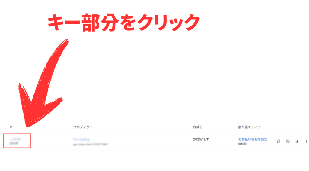 発行された長い文字列がAPIキーです。これは後で使うのでコピーしてメモしておきましょう。