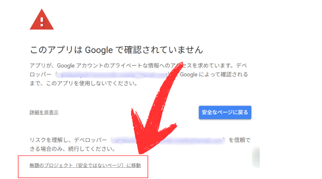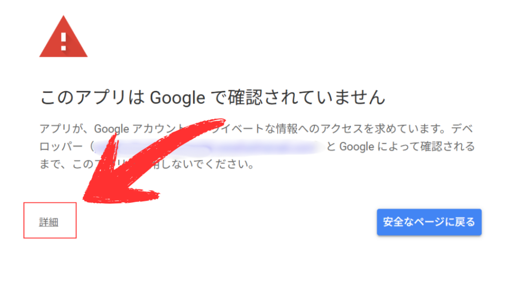 「このアプリはGoogleによって確認されていません」と出たら、左下の「詳細」をクリックし