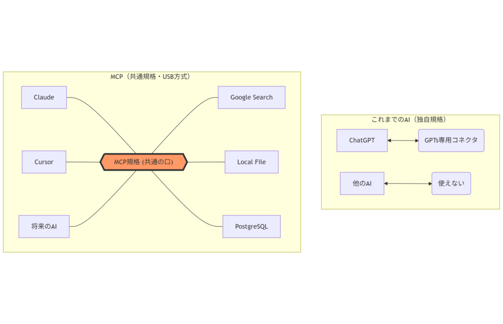 MCPは、AIが特定のツールやデータにアクセスするための「共通のプラグ」のような標準規格です。