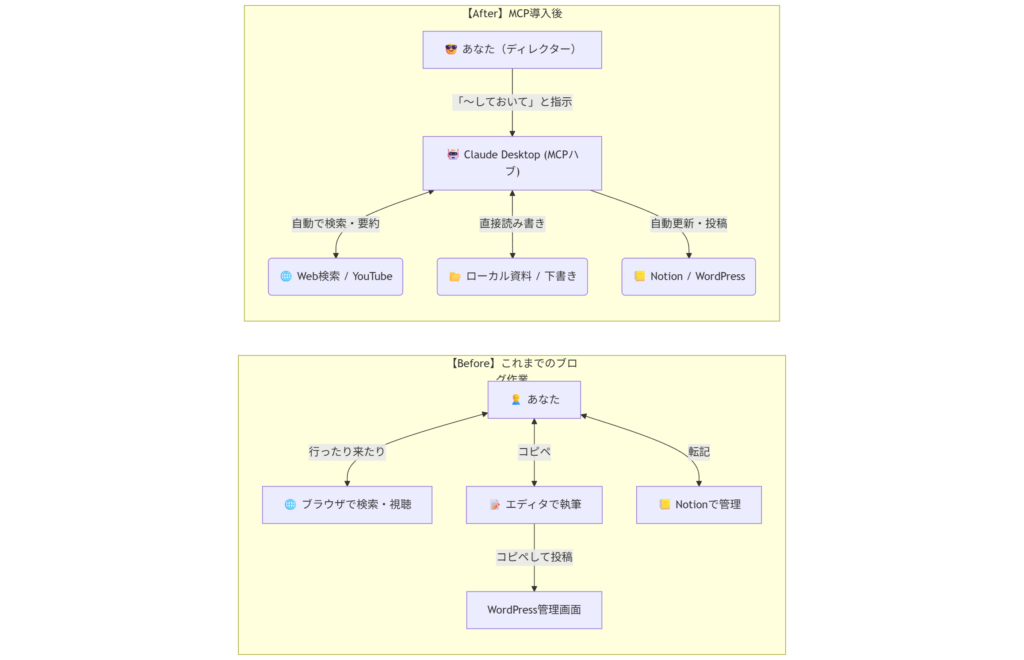 MCPを使えば、これまで手動で行っていたコピペやアップロード作業が不要になります 。